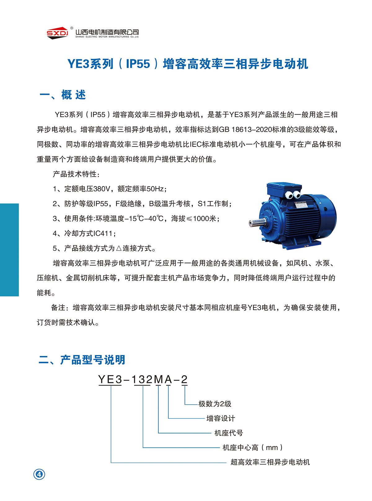 封閉式自扇冷卻籠型轉(zhuǎn)子高效三相異步電動(dòng)機(jī),設(shè)計(jì)符合IEC、GB等相關(guān)標(biāo)準(zhǔn)要求。YE3系列(IP55)增容高效率三相異步電動(dòng)機(jī),效率指標(biāo)達(dá)到GB18613-2020《電動(dòng)機(jī)能效限定值及能效等級》中3級能效水平。